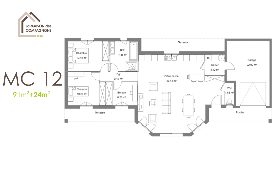 La Maison des Compagnons propose et maîtrise le bow-window depuis de nombreuses années. Vous aussi vous souhaitez une maison contemporaine avec un bow-window ? Nous sommes à votre entière disposition pour toute étude (gratuite et sans engagement) pour adapter ce modèle à votre terrain ou le personnaliser.