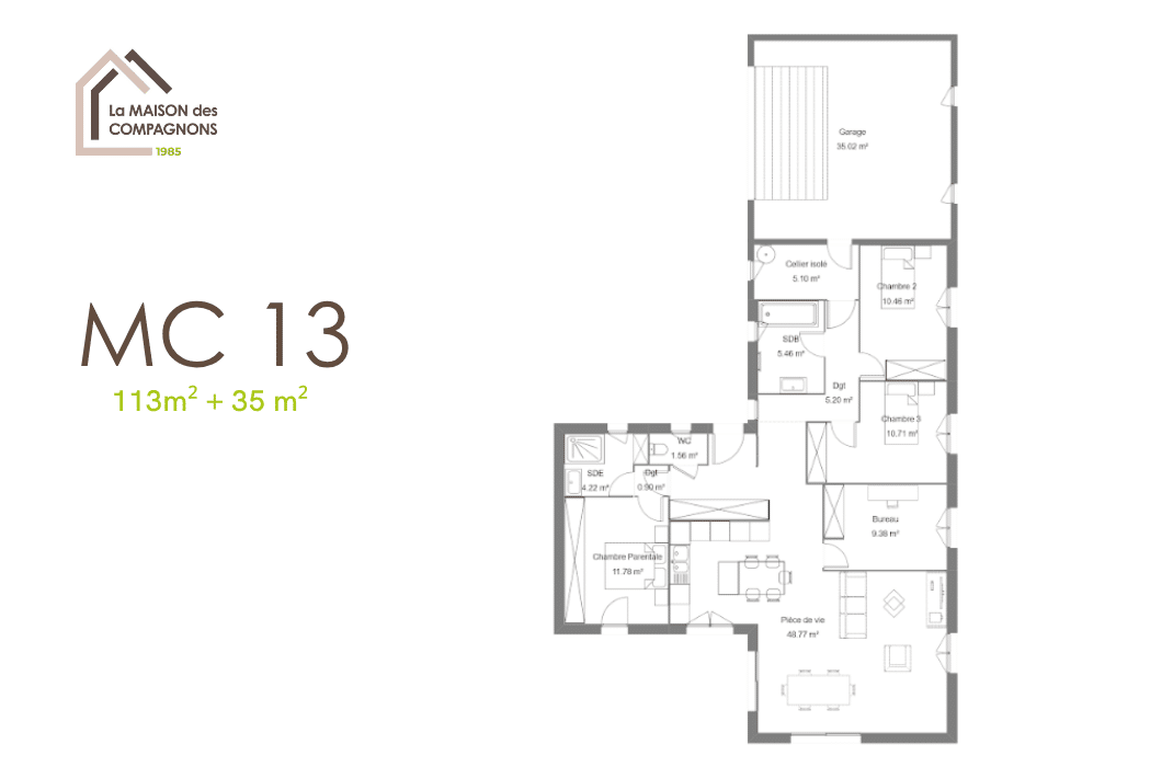 Ce modèle de maison individuelle de plain-pied en T s’articule d’une pièce de vie ouverte avec triple orientation (soleil levant à couchant). Ce modèle dispose d’une chambre parentale indépendante, spacieuse et fonctionnelle selon vos besoins et éloignés des enfants.