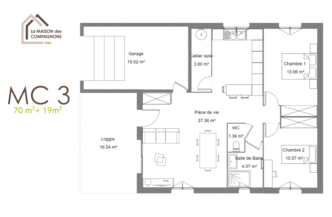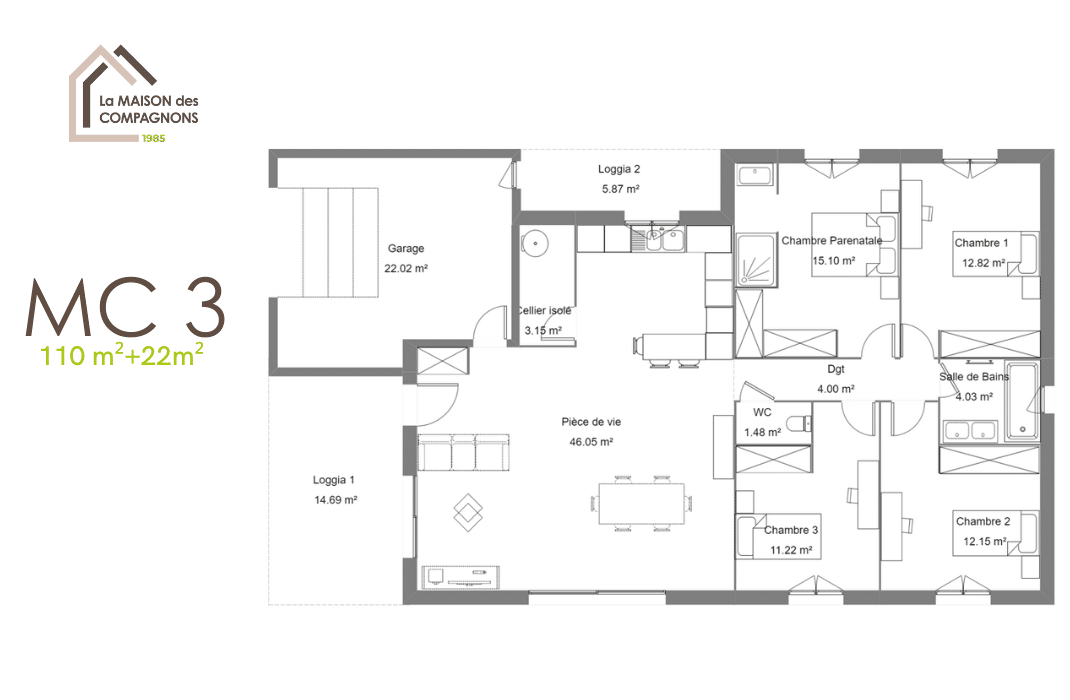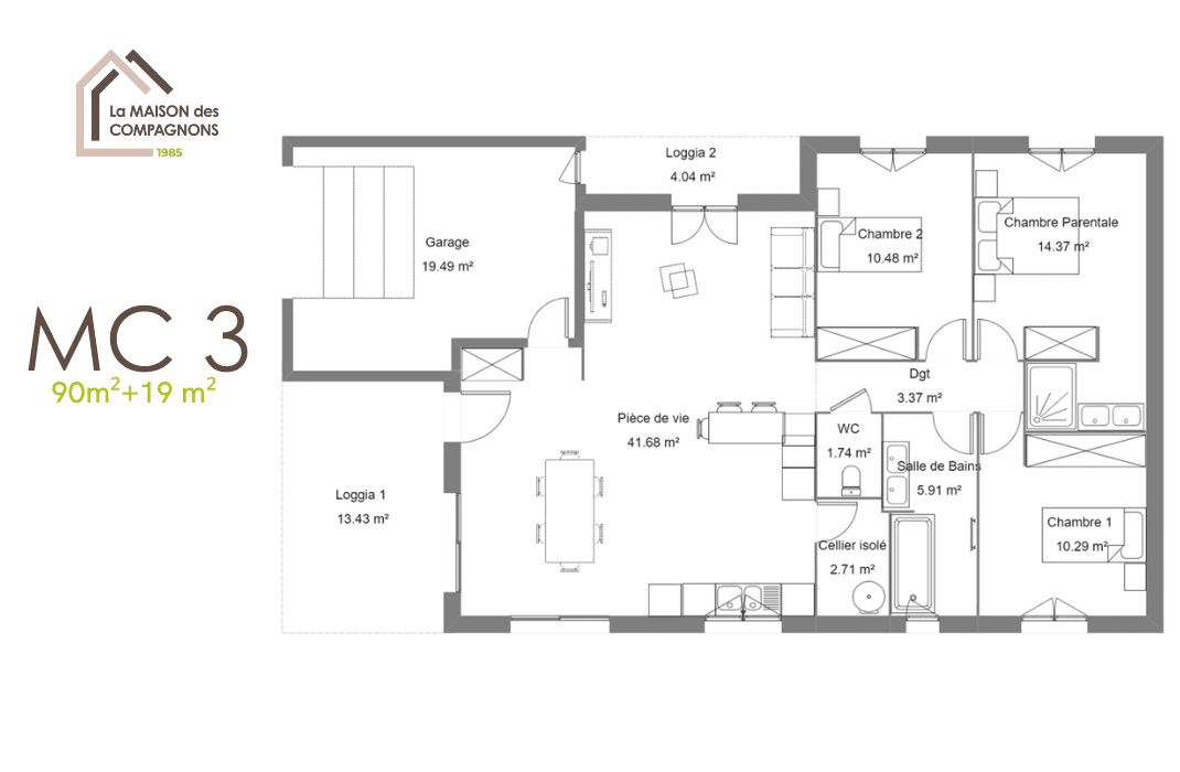 Ce modèle de maison rectangulaire de plain-pied et ses loggias cosys, vous séduira par sa distribution optimisée mais aussi par ses atouts extérieurs abrités qui vous permettront d’apprécier le plein air.